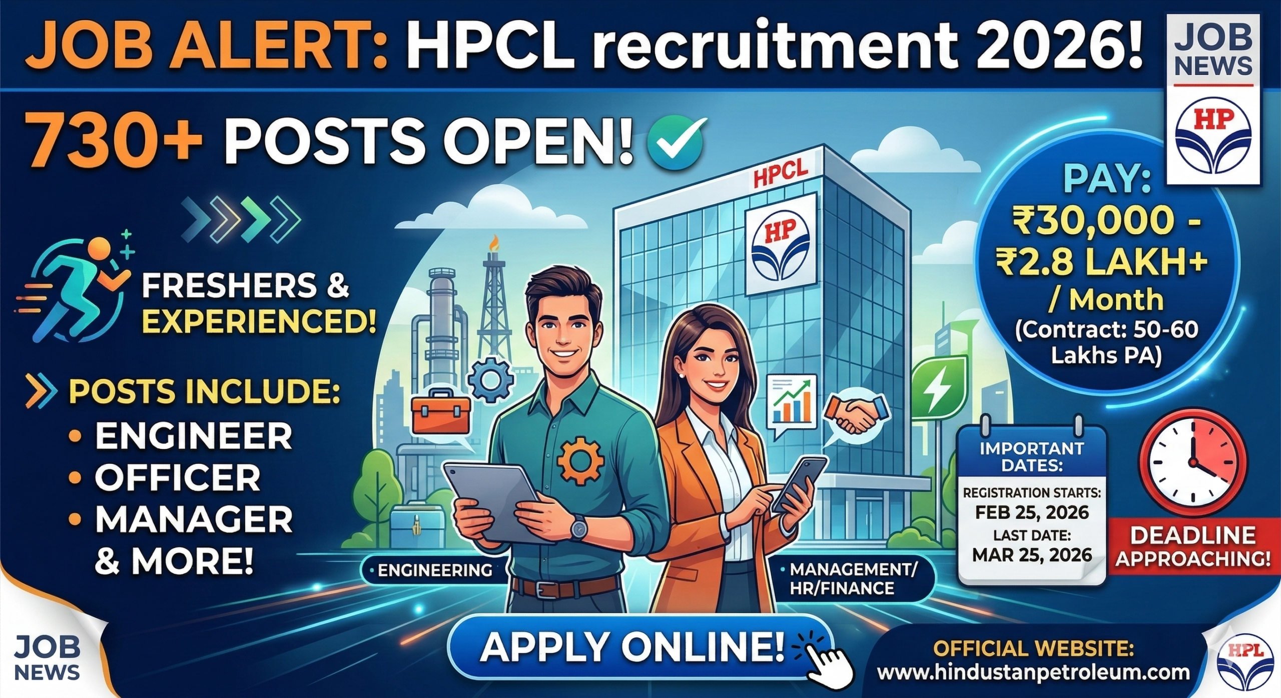 নতুন দিল্লি: রাষ্ট্রায়ত্ত সংস্থা হিন্দুস্তান পেট্রোলিয়াম কর্পোরেশন লিমিটেড (HPCL) বিভিন্ন বিভাগে ৭৩০টিরও বেশি পদে কর্মী নিয়োগের বিজ্ঞপ্তি প্রকাশ করেছে। ‘মহারত্ন’ এই সংস্থায় জুনিয়র এক্সিকিউটিভ, ইঞ্জিনিয়ার, অফিসার এবং ম্যানেজারসহ একাধিক পদে ফ্রেশার্স (Freshers) এবং অভিজ্ঞ (Experienced) প্রার্থীদের নিয়োগ দেওয়া হবে। আবেদনের প্রক্রিয়া শুরু হয়েছে ২৫শে ফেব্রুয়ারি ২০২৬ থেকে।